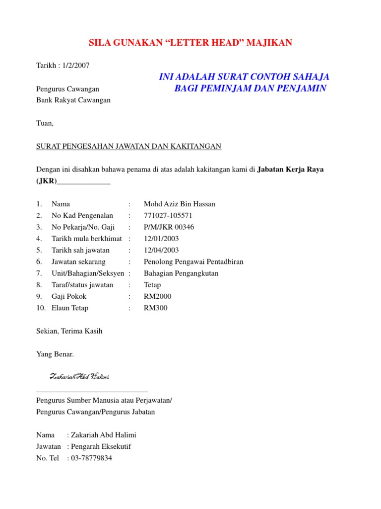 Pengesahan pekerja sulaiman bin ashari adalah disahkan bahawa pekerja di atas, sulaiman bin ashari, no kad pengenalan : Agar surat terjamin keabsahannya, surat pengalaman kerja membutuhkan tanda tangan beberapa orang yang berwenang. Contoh surat pemberian kuasa perseorangan ini, seperti. Manakala surat pengesahan jawatan pula. Apakah anda memerlukan surat keterangan kerja?