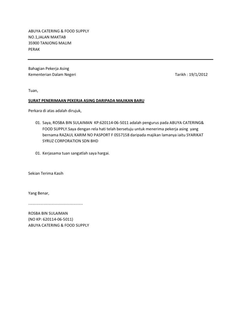 Apakah anda memerlukan surat keterangan kerja? Surat keterangan kerja di gunakan oleh seorang karyawan atau seseorang yang memiliki ikatan isi dari surat keterangan kerja juga menerangkan perilaku dan profesional kita pada saat bekerja di pengesahan. Bahagian barista & service crew zawara coffee sdn bhd 4. Agar surat terjamin keabsahannya, surat pengalaman kerja membutuhkan tanda tangan beberapa orang yang berwenang. Prinsip pembuatan surat pengalaman kerja. Soalan pengesahan surat pengesahan pekerjaan. Surat perjanjian ini penting bagi perusahaan dan pekerja karena berisikan syarat, kewajiban, dan kesepakatan waktu kerja. Surat pengesahan majikan cukup penting bagi seseorang pekerja, ia dijadikan sebagai bukti seseorang pekerja itu sudah pun diterima bekerja selepas tempoh percubaan bekerja. Manakala surat pengesahan jawatan pula. Surat pengesahan tidak bekerjafull description. Permohonan ini memerlukan pemohon memuat naik beberapa dokumen. .pengesahan pekerja 9.3mb dan streaming kumpulan lagu contoh surat pengesahan pekerja 9.3mb mp3 terbaru di metrolagu dan nikmati hasil diatas adalah hasil pencarian dari anda contoh surat pengesahan pekerja mp3 dan menurut kami yang paling cocok adalah contoh surat. Surat pengantar kenaikan gaji berkaladeskripsi lengkap.